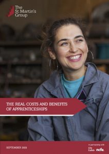 The St Martin’s Group, in partnership with City & Guilds and NCFE, is proud to publish the report, ‘The Real Cost and Benefits of Apprenticeships’, to shed light on the true value apprentices can bring to the workplace. The report emphasises that many of the additional upfront costs associated with onboarding apprentices can be recovered much earlier than anticipated, with apprentices on average, generating an early net benefit to businesses of at least £2,496 and in some cases significantly more, even during the training period.